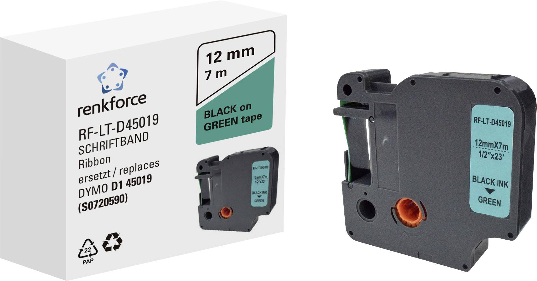 Cassetta nastro Renkforce RF-LT-D45019 Compatibile sostituisce DYMO D1 - 45019 12 mm Colore Nastro: Verde Colore caratte